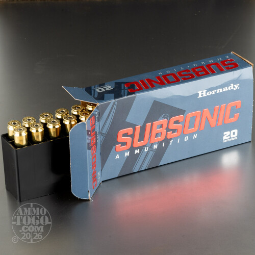 Hornady’s Subsonic ammo is brass cased for even better functionality in a semi-auto. Each round’s low flash powder comes to life at the command of a very sensitive and non-corrosive Boxer primer, giving you a reliable solution for crepuscular hunting.