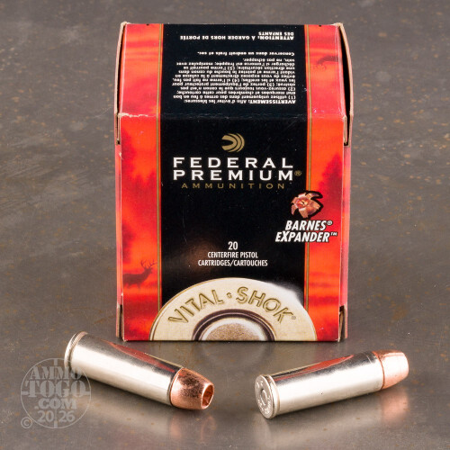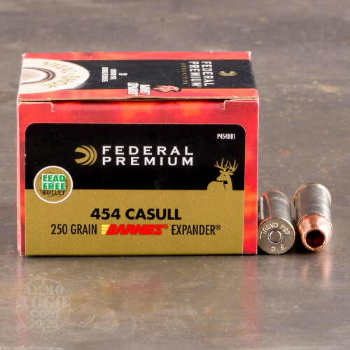 This is .454 Casull Federal Vital-Shok 250gr. Barnes Expander Hollow Point Ammo. This ammo has been developed for handgun hunting which is one of the most challenging ways to take game. You choose to use your wheelgun because you like to get up close and personal with your trophy. The Vital-Shok with the Barnes Expander allows for outstanding expansion upon striking the target. This ammo comes packed in 20rds. per box.