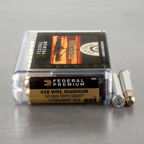 This is .458 Win. Magnum Cape-Shok 500gr. Trophy Bonded Sledgehammer Ammo. Expert safari and dangerous game hunters choose Federal Premium Cape-Shok. Designed for maximum effectiveness on large game with tough hide, heavy bone and muscle tissue such as Cape Buffalo and Elephant. Don't trust the hunt of a lifetime to anything less. Nickel coated brass cased, boxer primed, non-corrosive and non-magnetic. Comes packed 20rds. per box.