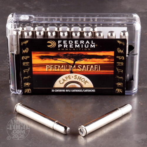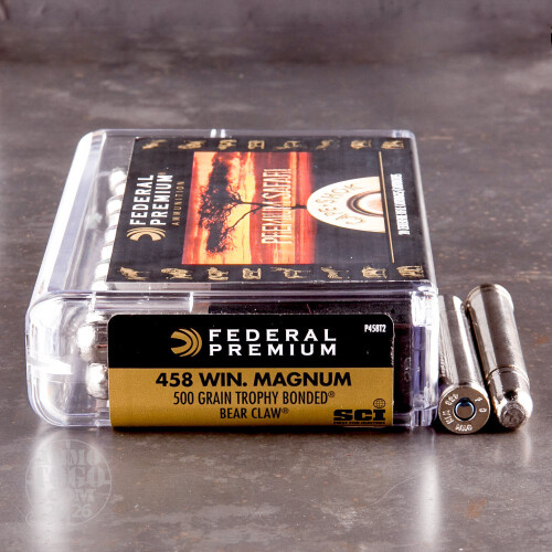 This is .458 Win. Magnum Federal Cape-Shok Premium Safari 500gr. Trophy Bonded Bear Claw Ammo. Expert safari and dangerous game hunters choose Federal Premium Cape-Shok. It's available with the finest bullets including Trophy Bonded Bear Claw. Plated bullet for corrosion protection. Grooved shank for improved accuracy and reduced fouling. An improved manufacturing process makes Trophy Bonded bullets even more reliable. Don't trust the hunt of a lifetime to anything less. Nickel coated brass cased, boxer primed, non-corrosive and non-magnetic. Comes packed 20rds. per plastic box.