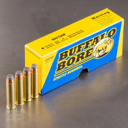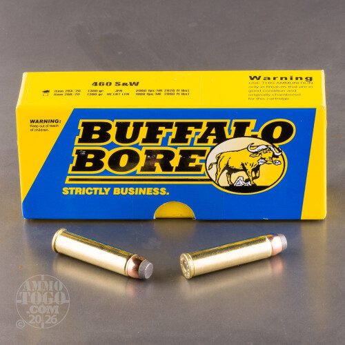 This is 460 S&W Buffalo Bore 300gr. Jacketed Flat Nose Ammo. This ammo is brass cased, boxer primed, non-magnetic and non-corrosive. It comes packed in 20rd. boxes. Muzzle Velocity: 2060fps.