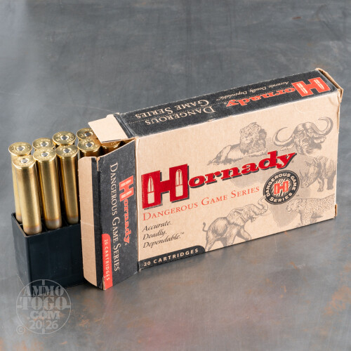 This ammunition is non-corrosive and features quality boxer primers and powders carefully matched to each load, ensuring optimum pressure and velocity. Hornady Dangerous Game rounds also feature high-quality brass cases. Each round produces a consistent muzzle velocity of 2150 feet per second and 5132 foot pounds of hard-hitting muzzle energy. This ammunition comes packed in 20-round boxes.