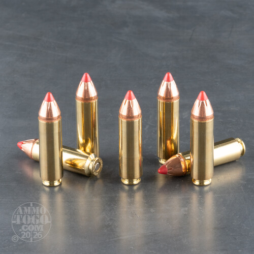 Going hunting for thick-skinned hogs, or where bucks may be shielded by heavy vegetation? Then the indisputable power of the 50 Beowulf is set to be your best friend. This cartridge by Alexander Arms, the caliber’s inventor, is furthermore outfitted with one of the best hunting bullets on the market: Hornady’s FTX.This round’s 300 grain projectile features a pliant polymer tip that extends down into its tough, high antimony lead core. It reliably drives inward upon impact, even at lower velocities, to initiate wide expansion and a lethal transfer of energy. The FTX’s thick copper jacket extends into the core via Hornady’s InterLock ring, ensuring that the two remain fixed together to preserve the momentum requisite for deep penetration. This bullet’s notched jacket promotes more uniform expansion, and its cannelure prevents setback that could impact accuracy as well.