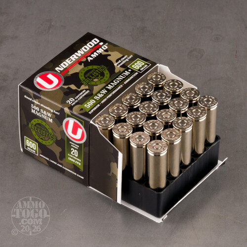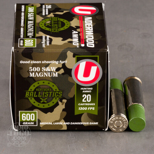 The 500 S&W Magnum – a perfect cartridge if you love recoil that will knock your socks off followed by terminal ballistics which can anchor anything that traipses around North America on four legs. Here’s your chance to fire Underwood’s best, which was designed in collaboration with Kentucky Ballistics!This round’s 600 grain projectile is a hard cast. It’s mostly made of lead, but it’s alloyed with additional metals that make it far too hard to deform as it pierces thick bone and dense flesh. The bullet will penetrate several feet deep while its broad nose profile gouges a devastating half-inch hole through the quarry. Underwood’s polymer coating virtually eliminates lead fouling, and it also keeps the bullet’s hard alloyed lead surface from grinding down the rifling. Great for target shooting and defense against dangerous game!