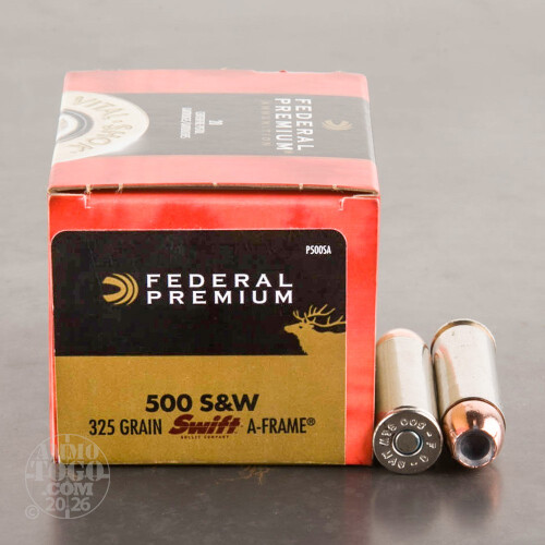 This is .500 S&W Federal Premium Vital Shok 325gr. Swift A-Frame Ammo. The Swift A-Frame bullet provides 95% weight retention and deep penetration. This Swift A-Frame bullet is matched with world class brass, select powders, and legendary primers to provide premium performance. This ammo comes packed in 20rds. per box.
