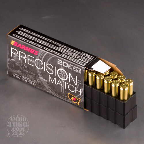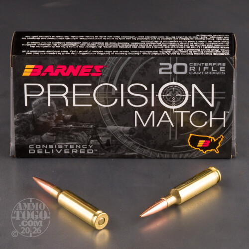 Barnes pairs their uniform match bullets with top quality components. These 20 rounds have interchangeable brass cases, non-corrosive Boxer primers, and charges of low fouling propellant. The Utah-based manufacturer exercises exacting quality assurance protocol to ensure every box of Precision Match ammo performs without aberration.