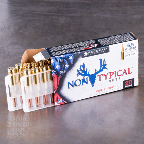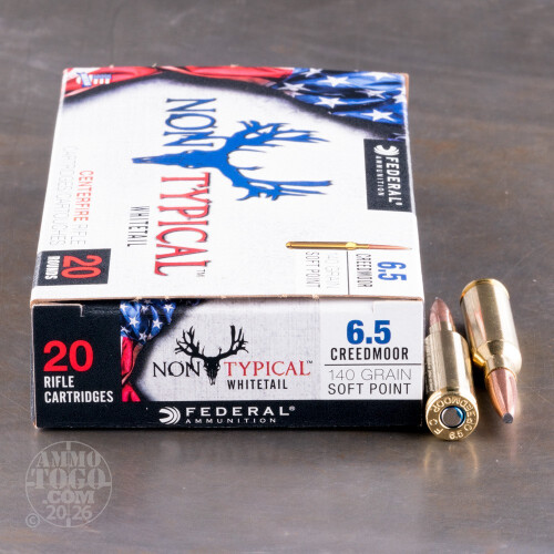 This 6.5mm Creedmoor Non-Typical ammo by Federal is optimized for hunting whitetail deer at long ranges. Originally designed by Hornady as a premium caliber for match shooting, the 6.5mm Creedmoor has proven itself to be a superior hunting cartridge. These cartridges include 140gr. soft point projectiles that depart the muzzle at 2750 fps with 2351 ft/lbs of energy for serious knockdown power. When it comes in contact with the target, the soft point bullet mushrooms aggressively causing wide and terminally effective wound channels. Equipped with Boxer-primers and carefully selected powder loads, this 6.5mm Creed ammo is the ultimate round for deer hunting. Each round is loaded into a new brass casing that is non-corrosive and reloadable.-