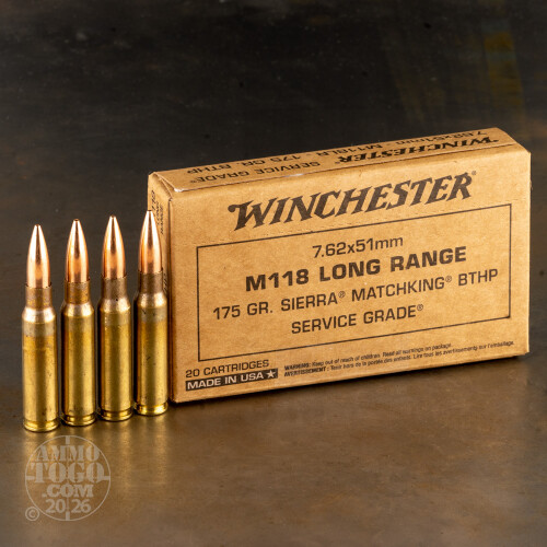 The “LR” in M118LR stands for “long range.” Chamber Winchester’s Service Grade M118LR ammunition in any 7.62x51 or 308 Win rifle and you’ll immediately become impressed by its long range performance. (Assuming that your aim is also good – but ammo can only help so much with that!)Winchester loads this sniper’s cartridge to precise specifications. The round achieves such heightened accuracy thanks to its 175 grain MatchKing by Sierra. That hollow point boat tail bullet has been used to win more target competitions than all other target bullets – combined.