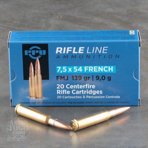 This package contains 20 rounds of Prvi Partizan 7.5x 54mm French MAS ammunition. Each cartridge is loaded with a 139 grain full metal jacket (FMJ) projectile. These FMJ bullets deliver almost zero terminal expansion, making these economical loads best suited for target shooting, tactical practice, and casual backyard plinking.
