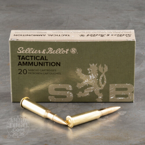 This package contains 20 rounds of Sellier & Bellot 7.62x54R ammunition. Each cartridge is loaded with an 80 grain full metal jacket (FMJ) projectile. These high-quality bullets feature a fully-jacketed lead core. Due to the rigid design of the metallic jacket, the projectile does not expand upon target impact, creating a smooth bullet hole in both organic tissue and paper targets.