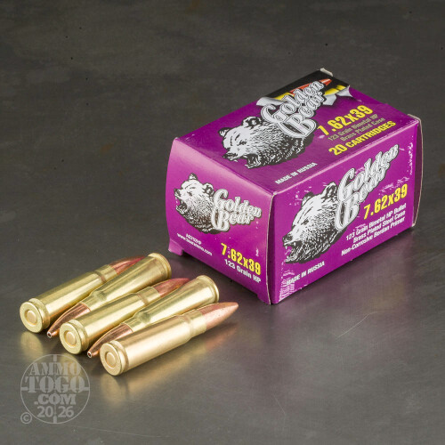 This is 7.62x39 Golden Bear 123gr. Hollow Point Ammo. This ammo is manufactured by JSC Barnaul Machine-Tool Plant in Russia. Barnaul is considered to be the premier ammunition factory in Russia, and it supplies most of the ammo to the Russian Military. This ammo has a unique brass plated steel case, which gives you all the characteristics of brass, at a fraction of the cost. Since this ammo is brass plated, it functions much smoother than any other steel cased ammo. This ammo looks, functions, and shoots just like brass cased ammo. This ammo is non-corrosive and the primer is sealed for moisture protection. It comes packed in 20rd. boxes.