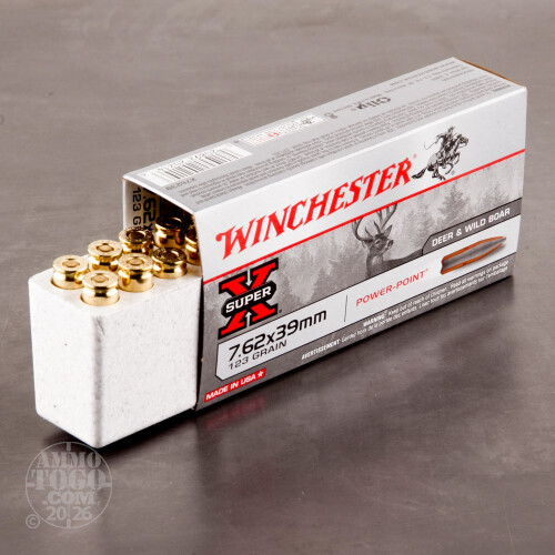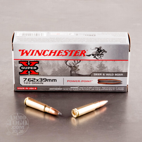 This is 7.62x39 Winchester Super-X 123gr. Soft Point Ammo. This 123 grain soft point bullet is designed for rapid, controlled expansion and maximum impact. This ammo has great weight retention and is a solid round for medium sized game. This ammo is brass case, boxer primed, non-corrosive and reloadable. It comes packed in 20rd. boxes. Manufacturer reported muzzle velocity: 2365 feet per second.