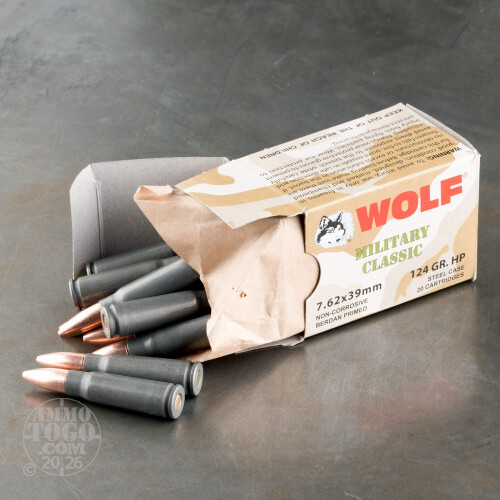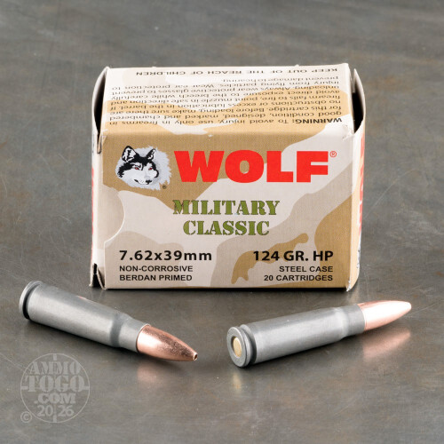 This is 7.62x39 Wolf Performance Ammunition Military Classic 124gr. Hollow Point Ammo. This ammo is made in Russia. This ammo does have the polymer steel case to eliminate any lacquer build up. It is berdan primed and 100% non-corrosive. It comes in 20rd. boxes.