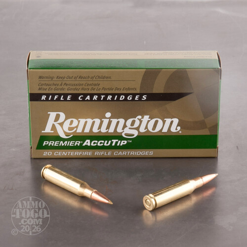 Featuring the most accurate polymer-tipped big game bullet on the market, Remington Premier AccuTip ammunition delivers lethal results. The polymer tip initiates immediate expansion while increasing the bullet’s ballistic coefficient. Jacket thickness is precisely tuned to deliver controlled terminal expansion on medium sized game. Featuring a hardened lead core, AccuTip projectiles deliver maximum weight retention, deep penetration, and powerful energy transfer, while the boat tail design increases down-range accuracy. The result is a level of accuracy, power, and performance that drops game dead in their tracks.
