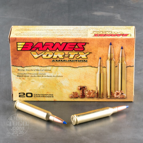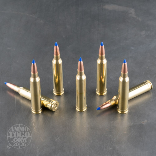The addition of a polymer tip increases ballistic coefficient of the standard TSX bullet and creates faster terminal expansion. Each of these Barnes Vor-TX 7mm Remington Magnum rounds produces a muzzle velocity of 3100 feet per second with 2987 foot pounds of muzzle energy.