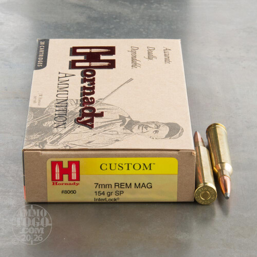 This is 7mm Rem. Mag. Hornady Custom 154gr. InterLock Spire Point (Soft Point) Ammo. This Interlock Soft Point ammo has proven its accuracy and knockdown power time and time again.This ammo is manufactured by Hornady and is considered to be the best factory loaded ammo available. If you want the very best, Hornady is your answer. This ammo is brass cased, boxer primed, non-magnetic, and non-corrosive. It comes packed in 20rd. boxes. Muzzle Velocity: 3035 fps.