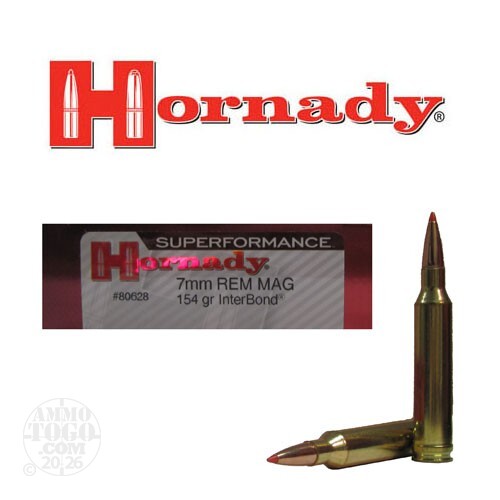 This is 7mm Rem. Mag. Hornady Superformance 154gr. InterBond Ammo. Hornady InterBond bullets use a proprietary bonding process that holds the core and jacket together regardless of what the bullet encounters. The polymer point improves ballistic performance, accuracy and initiation of expansion. This ammo is manufactured by Hornady and is considered to be the best factory loaded ammo available. If you want the very best, Hornady is your answer. This ammo is brass cased, boxer primed, and 100% non-corrosive. It comes packed in 20rd. boxes.
