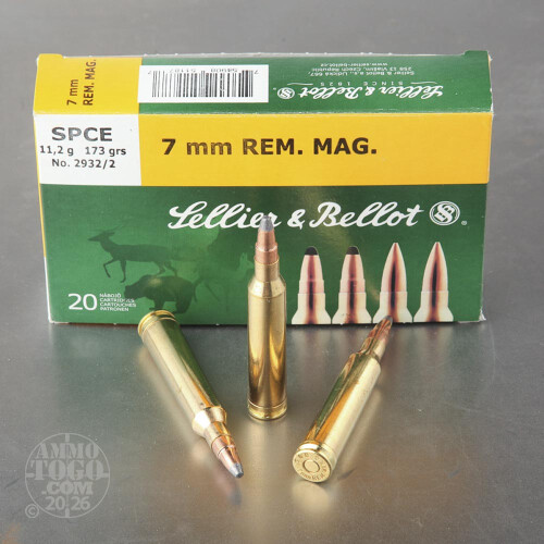 This is 7mm Rem Mag Sellier and Bellot 173gr. Soft Point Cutting Edge Ammo. This ammo is manufactured in the Czech Republic and is supreme quality ammunition. This ammo is boxer primed, brass cased and non-corrosive. It comes packed in 20rd. boxes. Muzzle Velocity: 2790 fps.