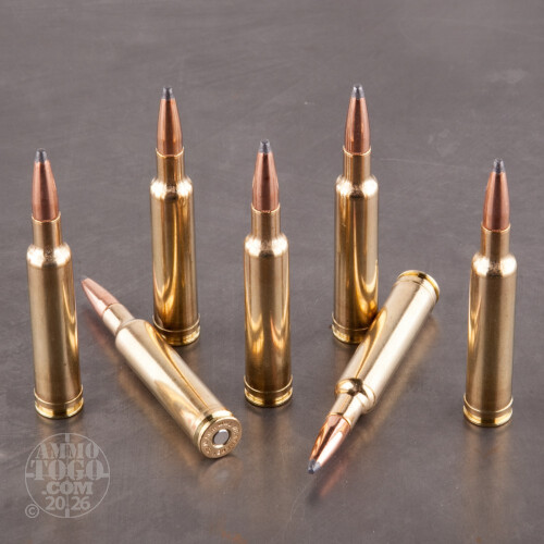 This 7mm Weatherby Magnum cartridge is made by Weatherby. Its performance is exceptional for hunting everything from whitetail to moose, and it’s even worth its salt during a safari if you’re after Africa’s thinner skinned game. Weatherby’s commitment to quality means that this round behaves just as a meticulously crafted handload would.This cartridge sports a 175 grain spire point projectile. The bullet owes a large part of its impressive 0.462 ballistic coefficient to its sharp, streamlined profile, so its trajectory and velocity drop only very little after having hurtled far downrange. This bullet’s core is exposed at the tip, enabling it and its jacket to peel back rapidly during penetration. The ensuing gaping wound channel will prove too devastating for even the ruggedest quarries to shrug off.