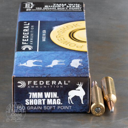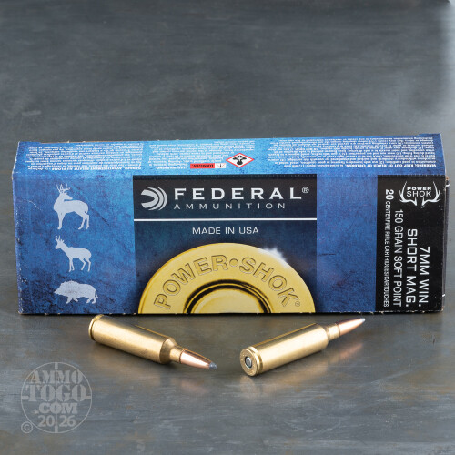 This is 7mm WSM Federal Power-Shok 150gr. Soft Point Ammo. Power-Shok ammo is just what you need to take your trophy and have a few bucks left to haul it to the taxidermist. All of Federal's "Classic" rifle options are now exclusively available under the Power-Shok name with the most popular big game cartridges featuring the Grand Slam soft point bullet from Speer. The unique jacket profile and fluted tip of the Grand Slam bullet ensures reliable expansion over a wide velocity range. Whatever your pursuit, Federal has you covered with Power-Shok Ammo. This ammo is packed in 20rd. boxes.