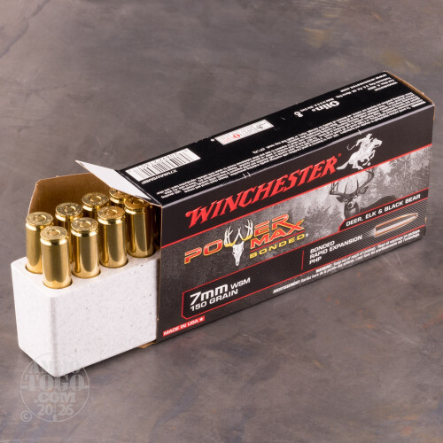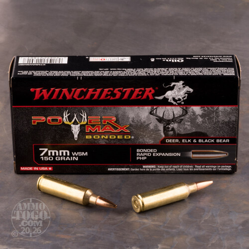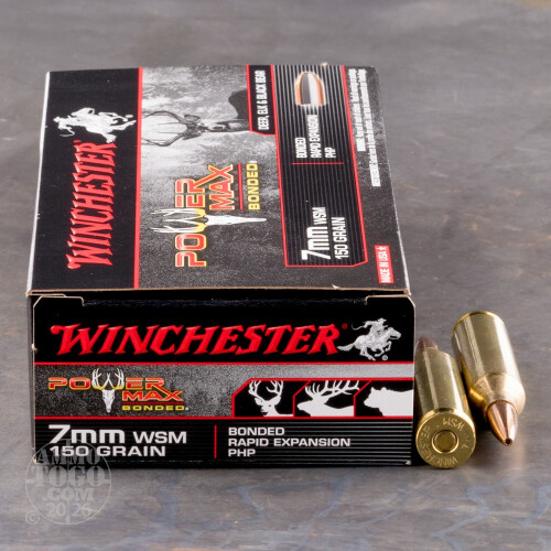 This package contains 20 rounds of Winchester Power Max Bonded 7mm Winchester Short Magnum ammunition. Each cartridge is loaded with a 150 grain bonded hollow point projectile. Winchester uses a unique bonding process to weld a soft lead core to a copper alloy jacket. This allows the core and jacket to act in unison during expansion to provide improved target penetration and maximum weight retention.