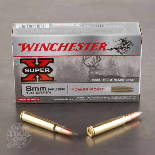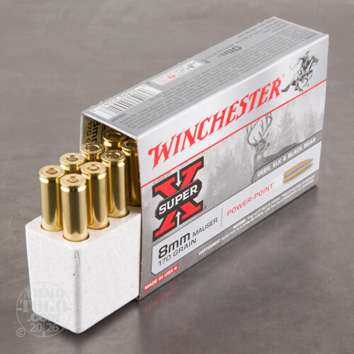 This is 8mm Mauser Winchester Super-X 170gr. Power Point Ammo. Winchester Super-X Power Point ammo is designed to retain velocity over long ranges. The unique soft nose jacketed design delivers maximum energy on target. Notches around the jacket mouth improve and ensure uniform, rapid expansion. This ammo comes packed in 20rd. boxes.
