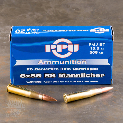 This package contains 20 rounds of Prvi Partizan 8x56R Mannlicher ammunition. Each cartridge is loaded with a 208 grain full metal jacket boat tail (FMJ-BT) projectile. Offering incredible long-range accuracy and minimal terminal expansion, these loads are perfectly suited for long-range target shooting and casual backyard plinking.