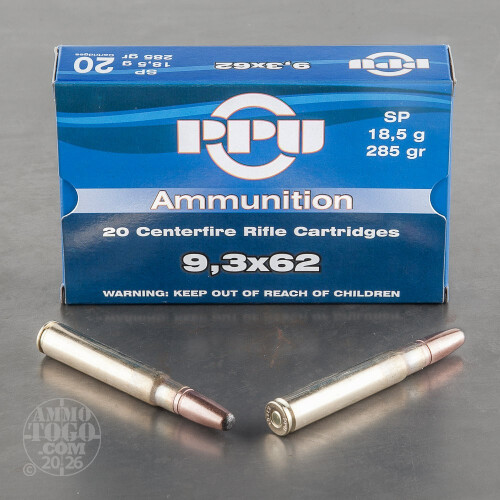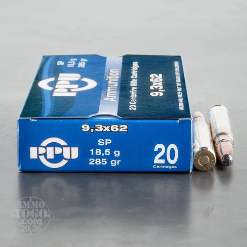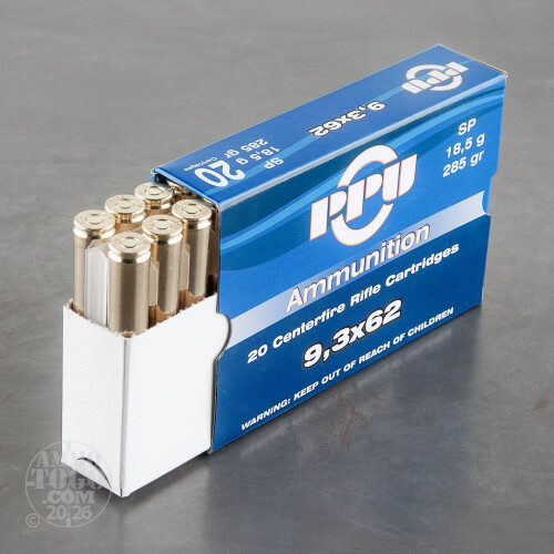This is 9.3x62mm Mauser PRVI Partizan 285gr. SP Ammo. The 9.3x62mm Mauser is an excellent hunting round, and is a viable all around hunting cartridge that has taken every dangerous species on the African and North American continents. This round has a muzzle velocity of 2265fps. This ammo is packed in 20rd. boxes.