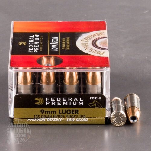 This is 9mm Federal 135gr. Hydra-Shok Personal Defense Jacketed Hollow Point Ammo. This ammo contains a post in the middle of the hollow point to give it rapid expansion and deep penetration. These 130 grain rounds are also very suitable for short barreled weapons and female shooters, because it is a reduced recoil round. This self-defense ammo has proven stopping power and comes packed in 20 round plastic boxes. Muzzle Velocity is listed by the Federal as 1060 feet per second.