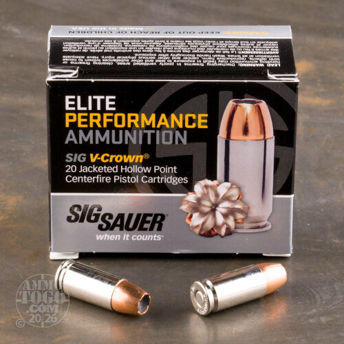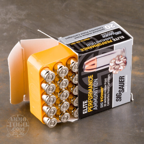 Sig Sauer doesn’t just make the Army’s newest standard issue 9mm pistols. The old European company also makes this premium self-defense ammo – right here in the USA. Give this ammo a shot if you carry a Sig pistol, or any other 9mm sidearm you’d entrust your personal safety to!Sig Sauer loads their Elite Performance pistol round with a jacketed hollow point bullet of their own design. It is the V-Crown, which combines a unique stacked hollow point nose cavity and precision-skived copper jacket to secure swift and decisive terminal expansion at high and low velocities alike. The V-Crown’s toothed cannelure helps to keep its seating depth unchanged while the cartridge is jerked back and forth during recoil. The cannelure also embeds the jacket inside the lead core; a feature that promotes more consistent penetration depth by reducing core/jacket separation.