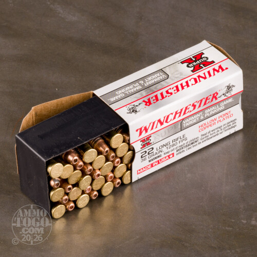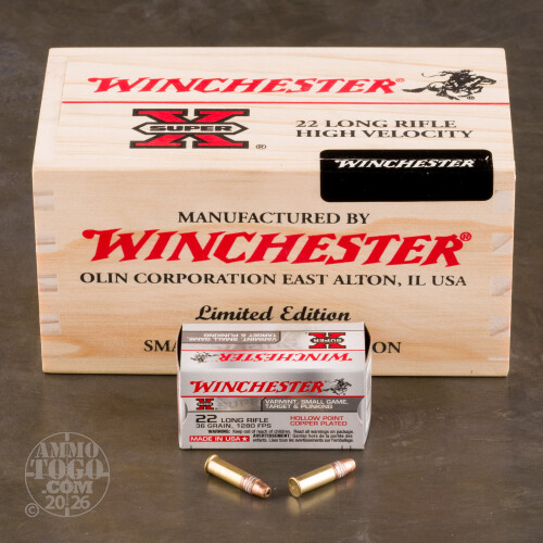 This brick of .22 LR ammo comes with a slight twist: each cardboard container is shipped inside of a vintage-style wooden sleeve which closely mirrors ammunition that could be found on the shelves decades ago. The wooden box is styled with a slide-away top and crisp painted labels and logos. Winchester doesn't intend this product to just be cosmetically pleasing, as each cartridge bears a copper-plated hollowpoint (CPHP) projectile in front of a high-velocity charge of clean-burning powder.Each CPHP bullet is designed to feed smoothly, fly in relatively flat trajectory, and leave behind relatively little lead fouling in a barrel. With a weight of 36 grains and a hollow cavity at its nose, the projectile can be expected to expand during its travel inside a small game target until it reaches vital areas and deposits its energy. In effect, the round is designed to bring down squirrels and rabbits quickly, effectively, and painlessly. Winchester is one of the most well-recognized shooting brands in the United States and is responsible for inventing calibers and weapon designs now in use around the globe.