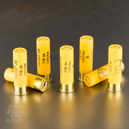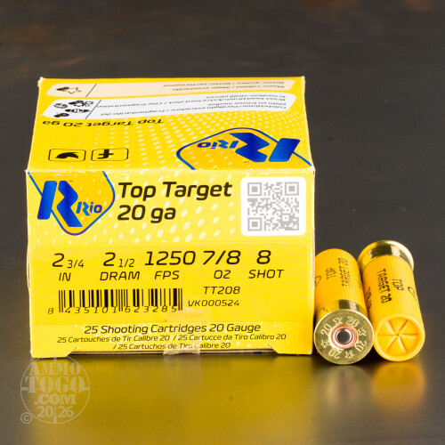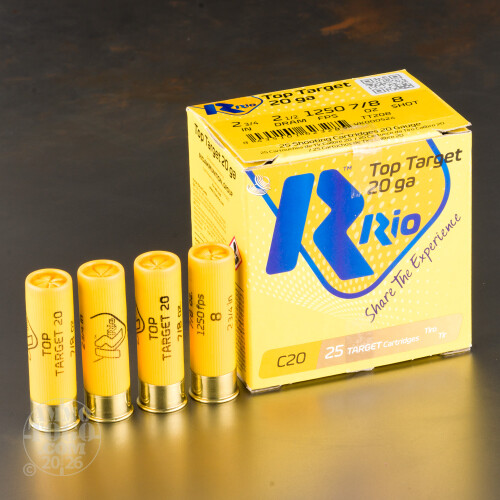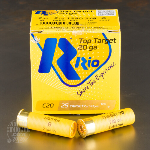 This is 20 Gauge RIO Top Target 2 3/4" 2 3/4 Dram 1oz. #7 1/2 Shot Ammo. This is Rio's top of the line target load and it travels at 1250 fps. This product epitomizes all of their tradition and experience of more than a century of manufacturing shotshells. This ammo is produced with different types of tubes, container wads and CSB powders to offer the best combination for each type of use and species to be hunted. This ammo is manufactured with a very balanced charge, which gives it high velocities and moderate pressures, which will produce efficient shot patterns. If you are tired of just seeing chips fly off your clays and not turning them into powder, this is your answer. This is the best target shell on the market for the money. This ammo is packed in 25rd. boxes, 250rds. per case.