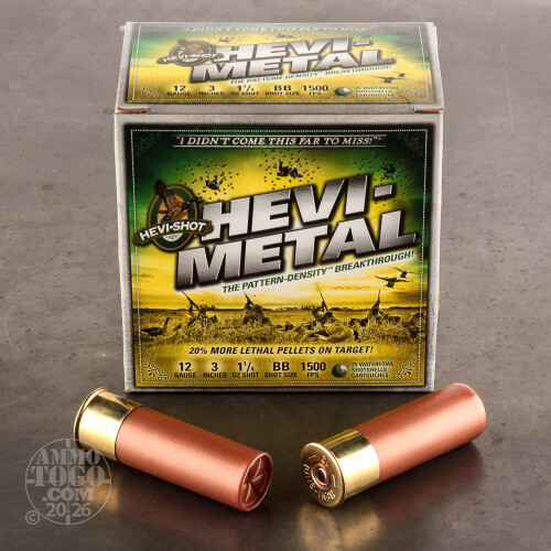 This is 12 Gauge Hevi-Shot 3" 1 1/4oz. Waterfowl #BB Hevi-Metal Ammo. Hevi-Shot's new Hevi-Metal Waterfowl Load uses new Pattern Density Technology to increase the number of pellets on target versus the competition. These shotshells put 20% more lethal pellets on-target at 40 yards than any steel ammunition. More lethal pellets equals more clean kills! Remember - you didn't come this far to miss! This ammo comes packed in 25rd. boxes.