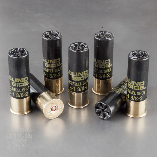 This 12 Gauge shotshell is from Winchester’s Blind Side of shotgun ammunition, and it’s loaded with 1 3/8 ounces of #2 Hex Shot. It’s able to fit such a hefty amount of shot due to Hex Shot’s unique cubic shape -- squares pack together much more closely than spheres can. Hex Shot’s shape also means that each pellet possesses 12 relatively sharp edges, enabling it to easily pierce waterfowl’s rugged plumage so it can create a deep and catastrophic wound channel. This shot is made of steel as well, so it’s perfectly safe for the wetlands, and the shell’s exceptionally fast muzzle velocity gives steel the oomph it needs to get its job done well.This shotshell features Winchester’s diamond cut wad, which works with its Hex Shot to create a consistent pattern that is up to a quarter wider than a traditional shell’s. You needn’t worry about this shell’s powder becoming ruined by moisture thanks to its Drylock Super Steel System which effectively seals water out.