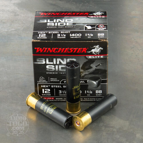 This is 12 Ga. Winchester Elite Blind Side 3 1/2" 1 5/8oz. BB Hex Steel Shot Ammo. This is Winchester's most innovative waterfowl line, Blind Side, which is loaded with Hex shot and a diamond cut wad system. It is designed to hit waterfowl like high-velocity tumbling bricks and it offers the most innovative features and benefits. Muzzle velocity of 1400fps. This ammo comes packed in 25rd. boxes, 10 boxes per case.