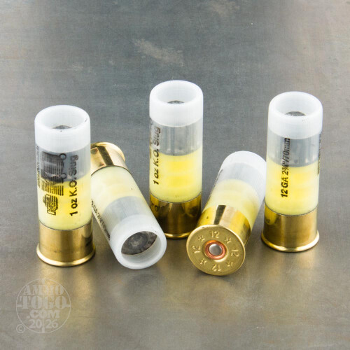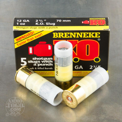 This is 12 Gauge Brenneke K.O. 2 3/4" 1oz. Slug Ammo. The K.O. Slug from Brenneke is more than just a slug, its a philosophy of real knockdown power. These shells are precision made, so you can expect exceptional performance in the field at a very reasonable price. This shell is designed to be an improved Foster-Type slug with an attached wad. K.O. Slugs guarantees outstanding accuracy as well as twice the penetration and 1/3 more energy transfer at the target than traditional slugs. This ammo is packed in 5rd. boxes, with 50 boxes in a case.