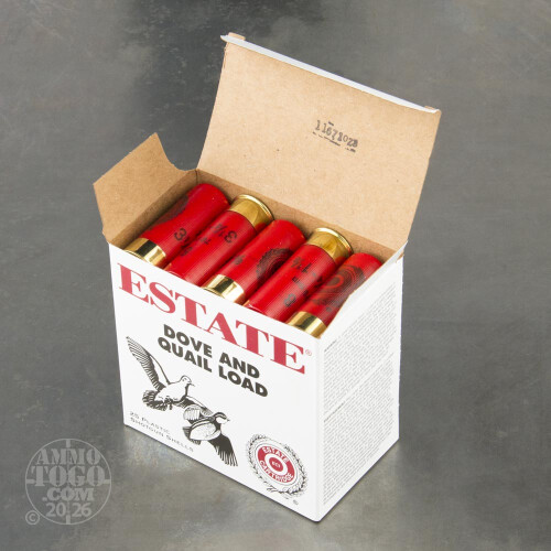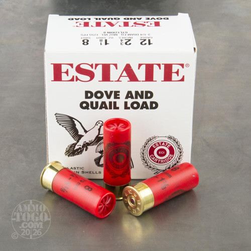 This is 12 Gauge Estate Dove and Quail Load 2 3/4" 3 1/4 Dram 1 1/8oz. #8 Shot Ammo. Estate Cartridge shotshells may be used for a variety of applications both in the field or at the range. It comes packed in 25rd. boxes, 10 boxes per case. Muzzle Velocity: 1255 fps.