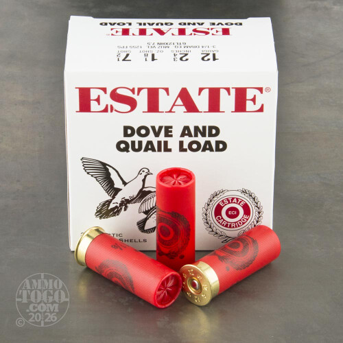 This is 12 Gauge Estate Dove and Quail Loads 2 3/4" 1 1/8oz. #7.5 Shot Ammo. Estate Cartridge shotshells may be used for a variety of applications both in the field or at the range. It comes packed 25rds. to a box, 250rds to a case. Muzzle Velocity: 1255 FPS.