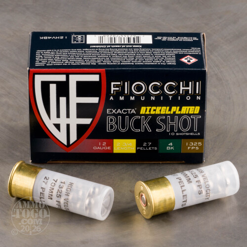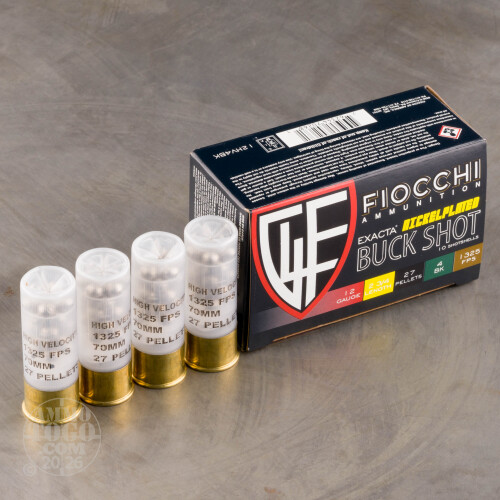 This is 12 Gauge 2 3/4" 27 nickel plated pellets with #4 buckshot Ammo. Nickel plated shot gives the hunter such benefits as denser, more consistent patterns with fewer stray pellets and increased range and penetration than non-plated shot. Nickel plating helps the shot pellets retain their original aerodynamic spherical shape during firing and passing through your shotgun's choke. Rounder pellets (as opposed to deformed, out of round pellets) have truer flight characteristics and give the benefits listed above. Nickel-plated shot pellets are rounder and therefore fly through the air with less resistance, helping to increase their velocity at impact. This increased velocity, combined with a resistance to deformation on impact with your game, contributes to deeper penetration. This deeper penetration helps the pellets break more bones and strike vital organs that help ensure quick, humane kills and less lost, crippled birds. In short, Fiocchi's nickel-plated shot contributes to a more successful hunt. The Velocity of this ammo is 1325 fps. It comes in 10rd. boxes, 25 boxes per case.