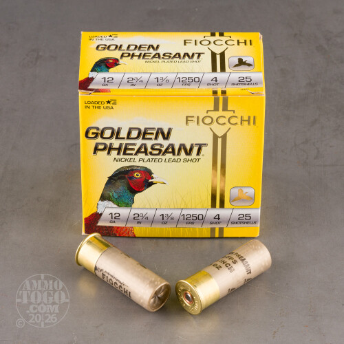 This is 12 Gauge Fiocchi Golden Pheasant 2 3/4" 1 3/8oz. #4 Shot Golden Pheasant Nickel Plated. Fiocchi has been manufacturing ammunition in Ozark, Missouri since 1986 and in Europe since 1876. Fiocchi ammunition is manufactured with pride from the finest raw materials and components, including hard uniform, functional one-piece plastic wads, clean consistent powders and consistent non-corrosive primers. Premium materials and strict, exacting standards of quality and consistency make Fiocchi a worldwide leader in innovation and design. Muzzle Velocity: 1250 fps.This ammo comes packed in 25rd. boxes and 250rds. per case.
