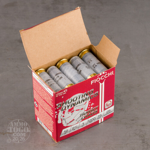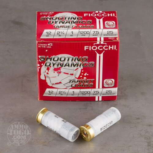 This is 12 Gauge Fiocchi Heavy Target Shooting Dynamics 2 3/4" 1oz. #7 1/2 Shot Ammo. Fiocchi's Target Shooting Dynamics line provides both competition shooters and the amateur clay shooters a selection of high performance rounds without the requisite price tag. Recoil in these shells are kept low without dramatically impacting velocity, a great benefit for those longer matches. Overall, a great performer at a great price. This ammo comes packaged 25rds to a box, 250rds to a case. Muzzle Velocity: 1200 fps.