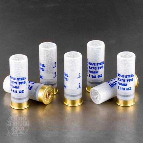 Is Fiocchi Steel Dove 12 Gauge ammunition designed for hunting small, robotic birds? No. That would be silly. What this ammo will do is allow you to hunt a broad variety of upland game – dove, of course, as well as quail, grouse, rabbit and squirrel – without inadvertently scattering little toxic lead granules all around the environment!This shell does a couple of things differently. Instead of the #7.5 shot (0.095” diameter) which is commonly used for dove hunting, it is loaded with #7 shot (0.100” diameter). The larger steel shot pellets still weigh less than smaller lead pellets would have been, but their slightly greater diameter does give the steel pellets a little more heft and resultant momentum downrange. Furthermore, this round has an unusually fast 1,375 fps muzzle velocity. That helps less dense steel shot pellets to acquire and retain more kinetic energy that they can transfer to the quarry on impact.