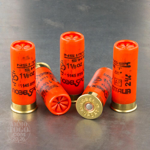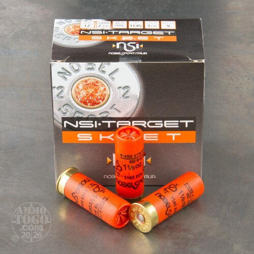 Manufactured by Nobel Sport Italia (NSI), this 12 gauge ammunition is a favorite among serious target shooters. Designed to meet the specific demands of the American skeet shooter, NSI Target Skeet loads are assembled using premium reloadable plastic hulls, even-patterning wads, specially formulated propellants, and Nobel Sport’s legendary 209-sized target primers. Each 2 ¾ inch 12 gauge shotshell is loaded with 1 ⅛ ounces of high antimony hard lead #9 shot. These new production rounds produce a consistent muzzle velocity of 1145 feet per second. Delivering consistent pattern density, reliable performance, and repeatable accuracy, these loads are engineered for the serious competition shooter.