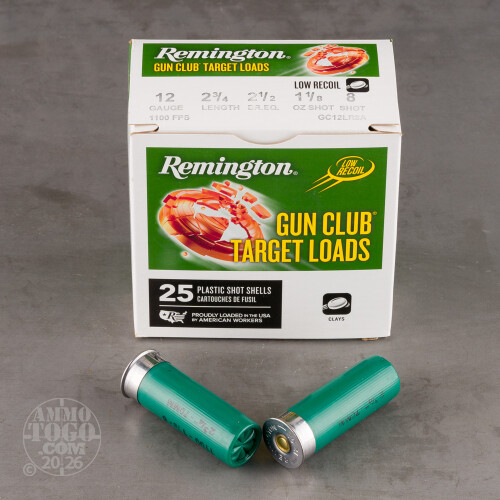 250rds – 12 Gauge Remington Gun Club Target Load Low Recoil 2-3/4" 1-1/8oz. #8 Shot Ammo Details