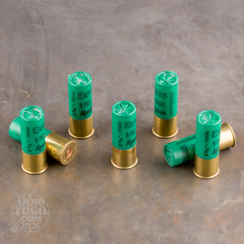 This 12 Gauge shotshell by Remington is loaded with nine pellets of 00 buckshot. The .33” diameter pellets are not only ideal for keeping your home profoundly un-burgled, but will make quick work of any buck which finds nine or even fewer of them tunneling through his hide. Take note if you would implement this shell for home defense -- any pellets that don’t find a burglar will find whatever’s on the other side of the first wall that they strike.This shotshell features heavy cushioning behind its shot column in order to lessen perceived recoil, and further offers synthetic buffering material to ensure its shot doesn’t deform in the barrel and flies true. You’ll find none of this shell’s high quality components wanting in any way, either -- its shotgun primer is sensitive and non-corrosive, its powder burns clean to keep your action undistressed, and its hull is sturdy enough to reliably handle its powerful blast.