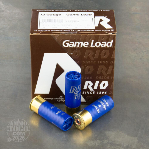 This is 12 Gauge Rio Game Load 2 3/4" 3 1/4 Dram 1 1/4oz. #9 Shot Ammo. Rio Ammunition products all have a very balanced charge developing high velocities and moderate pressures which produce extremely efficient shot patterns, time after time. Muzzle velocity 1250fps. This ammo comes packed 25rds. per box, 250rds. per case.