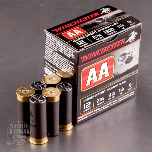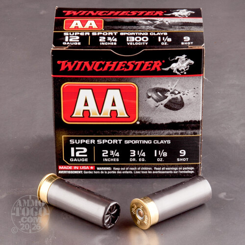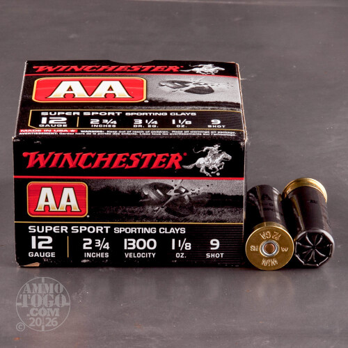 This is 12 gauge Winchester AA Sporting Clay ammunition. This ammo is loaded with 1-1/8 ounce of #9 shot and comes in a 2-3/4 inch shell. This 12 ga load is designed for exceptional sporting clay performance by producing repeatable and reliable shot spread, so you know exactly where your shot is going. THis ammo has an advertised muzzle velocity of 1300 feet per second. It come packaged with 25 rounds per box, and 10 boxes per case.-