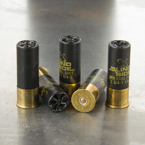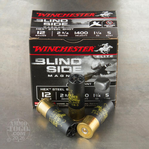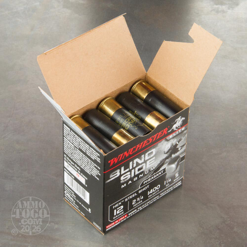 This is 12 Gauge Winchester Blind Side Magnum Pheasant 2 3/4" 1 1/4oz. #5 Shot Ammo. Blind Side combines ground-breaking, Stacked Hex Steel Shot technology and the diamond cut wad in the most deadly High Velocity Winchester waterfowl load available. Loaded with 100% hex shot, these loads deliver high energy, trauma-inducing pellets for fast kills. The Blind Side Pheasant rounds are specifically designed for the pheasant hunters who desire the greatest performance from their shells whether flushing birds up close or from a distance. It comes packed in 25rd. boxes, 250rds to a case. Muzzle Velocity: 1400 FPS.