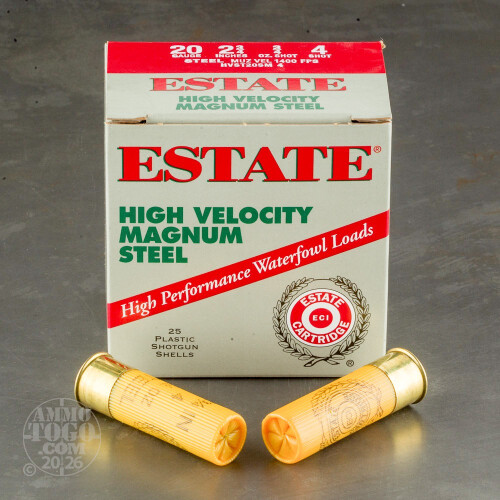 This is 20 Gauge Estate HV 2 3/4" 3/4oz. #4 Shot Steel Ammo. These High Velocity Magnum Steel loads are high performance waterfowl loads. These Estate shells are the result of extensive research and development to provide the professional, seasoned, or occasional waterfowl hunter with performance second to none in all weather conditions. Muzzle velocity of 1400fps. This ammo comes packed in 25rd boxes, 250rds per case.