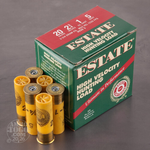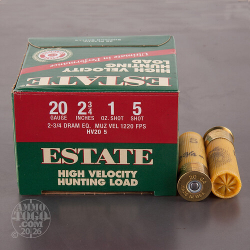 This is 20 Gauge Estate High Velocity Hunting 2 3/4" 2 3/4 Dram 1oz. #5 Shot Ammo. Estate Cartridge High Velocity Hunting shotshells may be used for a variety of applications both in the field or at the range. This ammo comes packed in 25rd. boxes. Muzzle Velocity: 1220 fps.